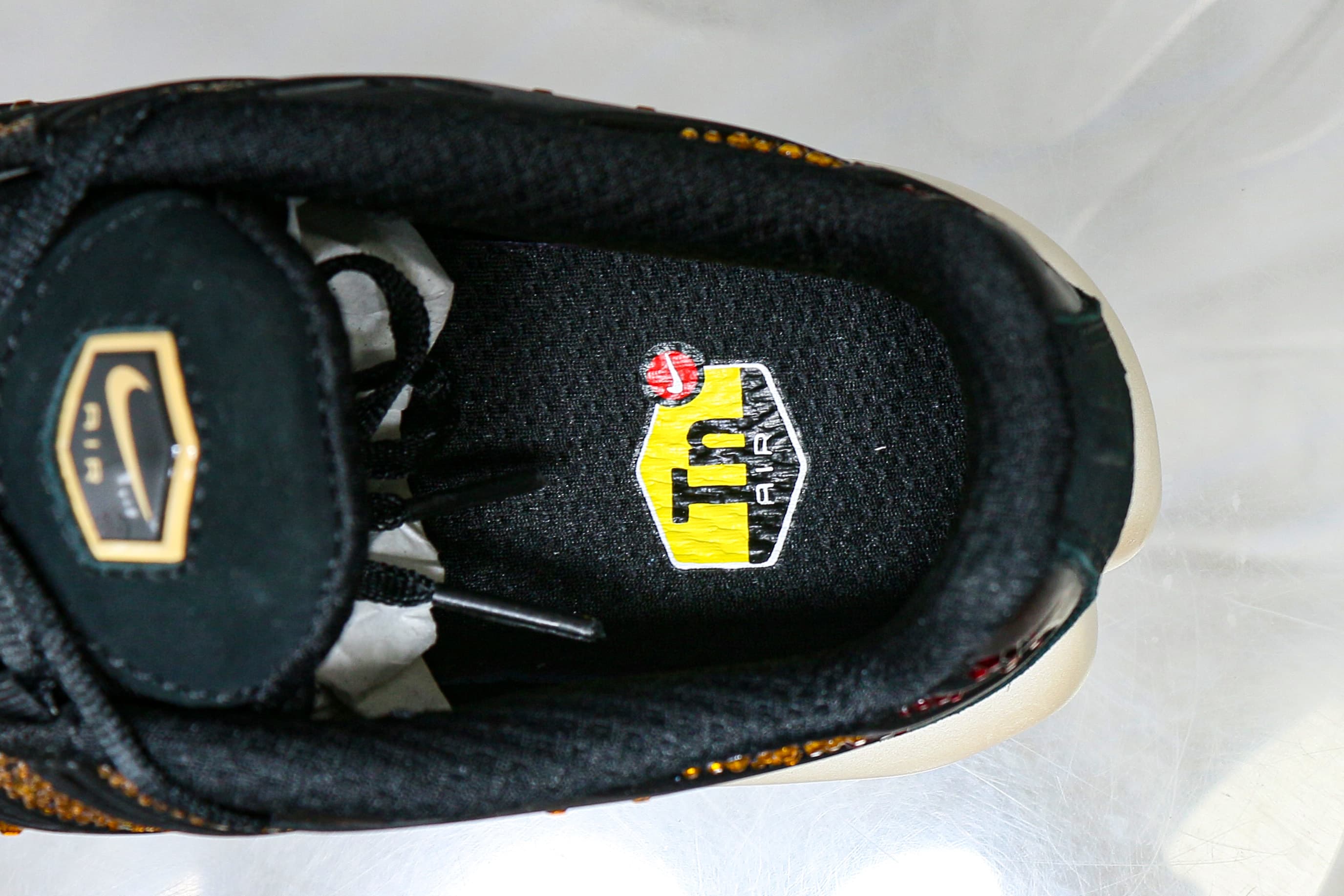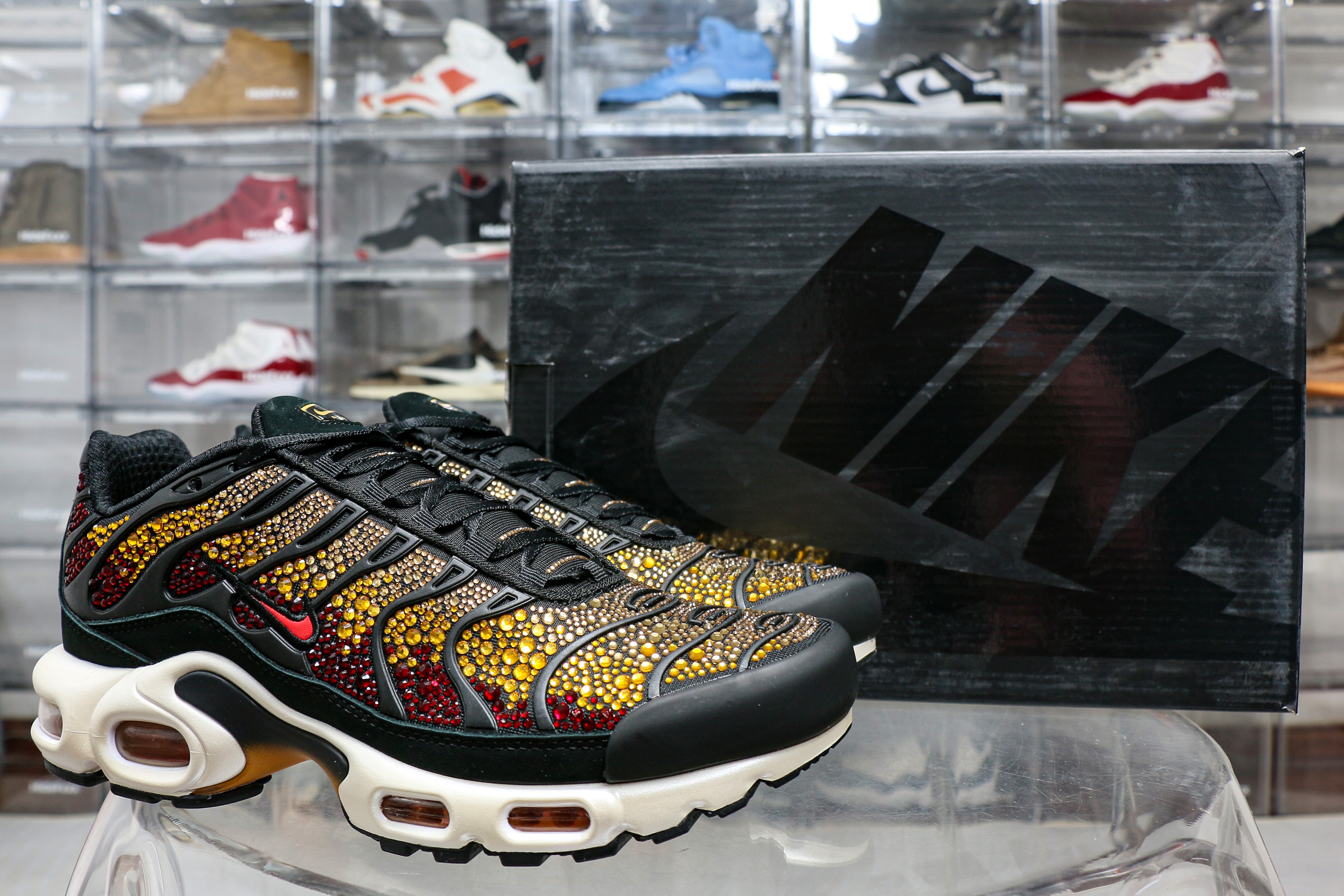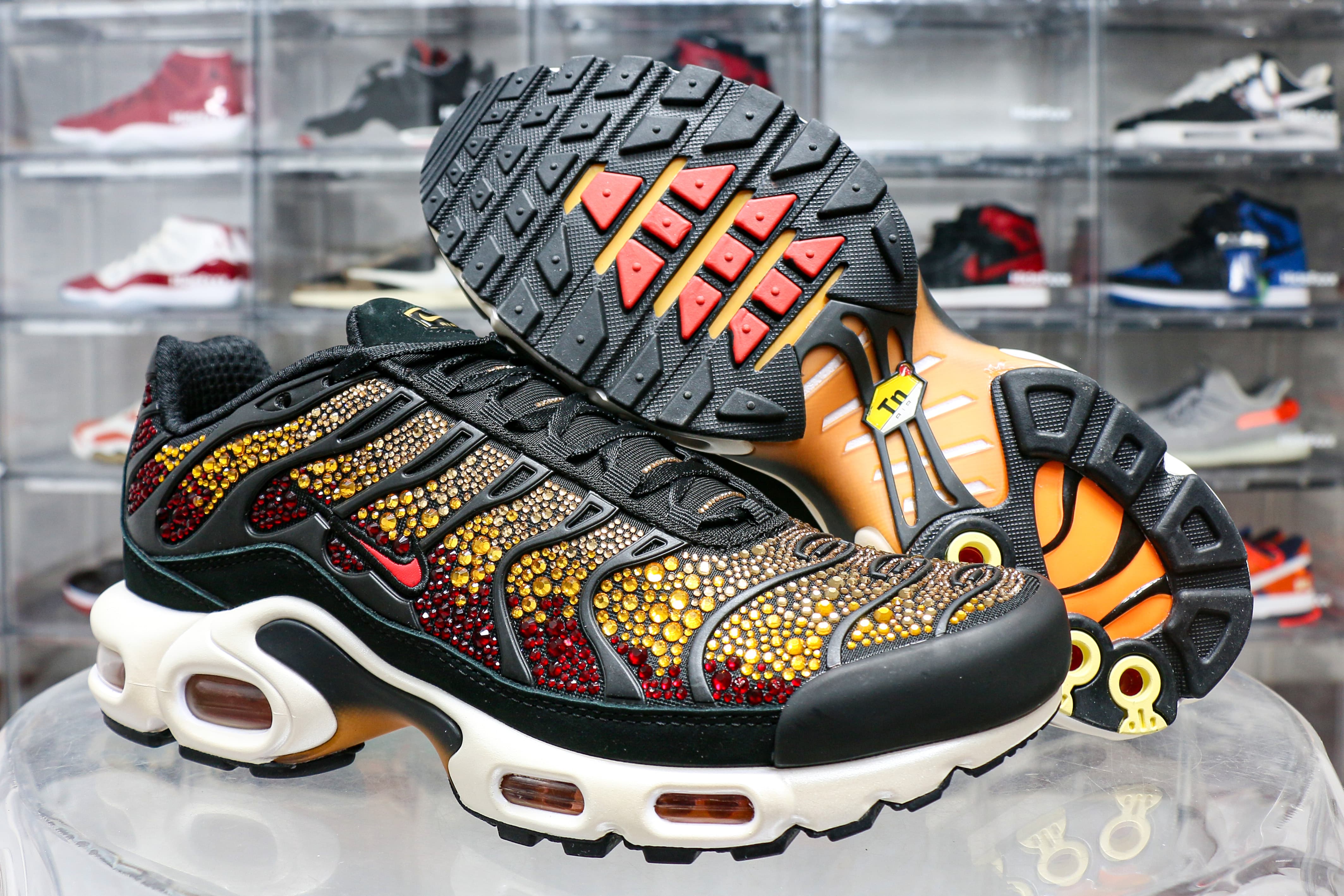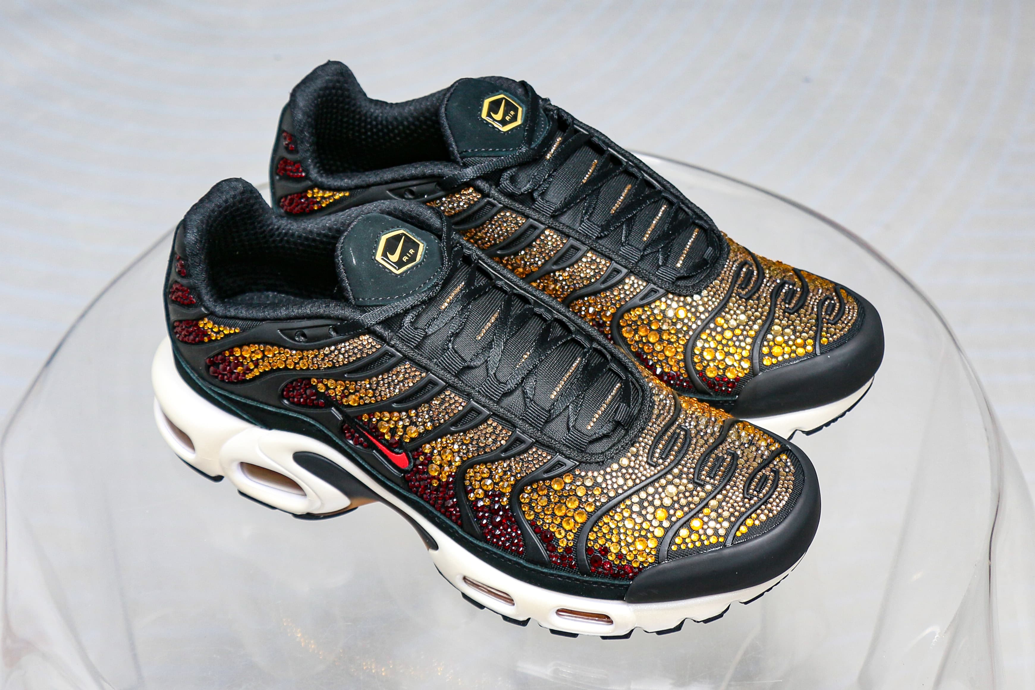 The Swarovski x Nike Women’s Air Max Plus ‘Sunset’ sports Swarovski crystals in a sunset-inspired mosaic, using a gradient blend of red, orange and yellow on the upper. Bold black pops land on the wavy cage and suede mudguard, while a red mini-Swoosh is piped in black embroidery and the Tn Air badge adorns the back heel. An off-white foam midsole contains a shank for stability and visible Air-sole units in the forefoot and heel.
