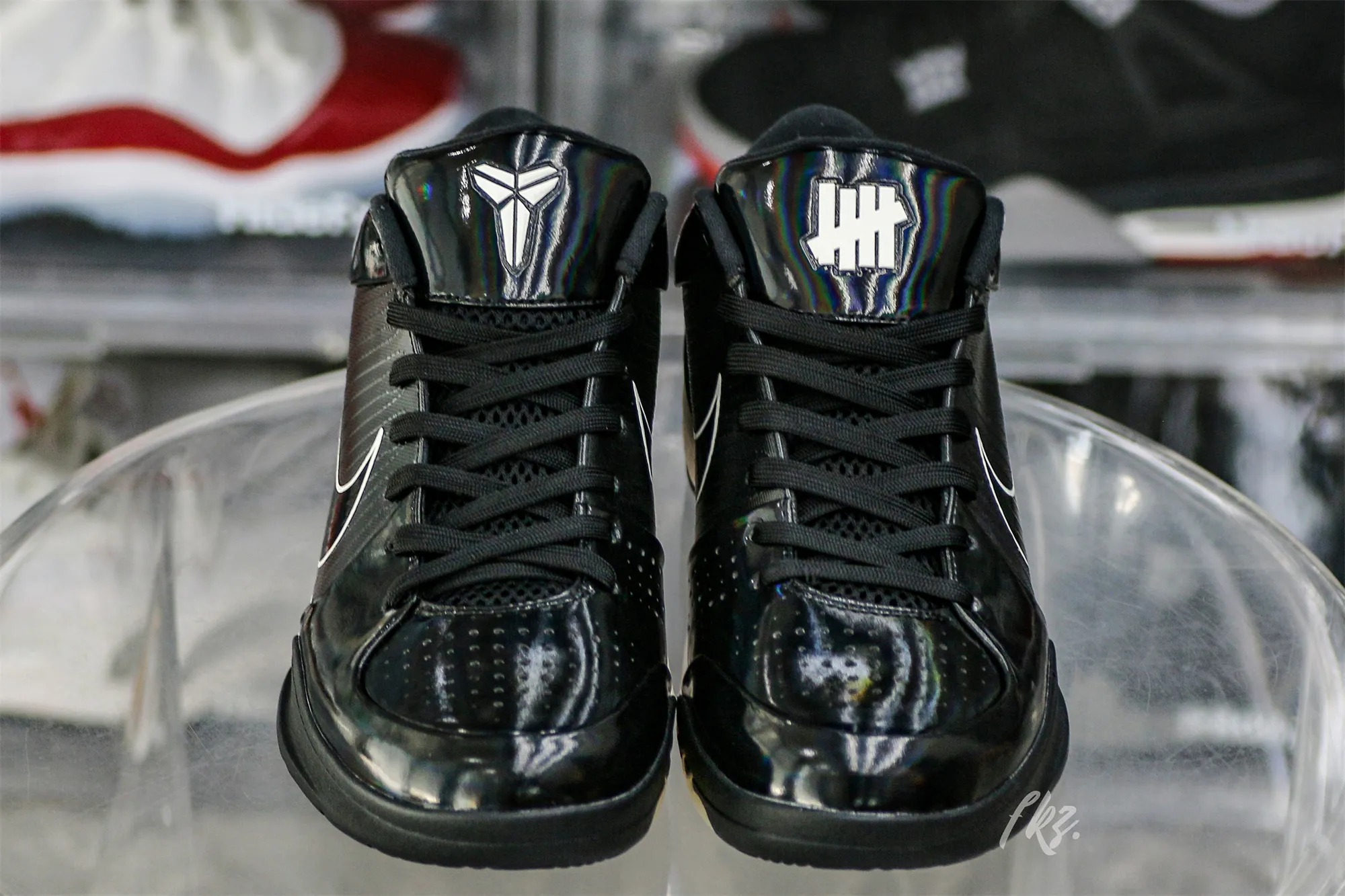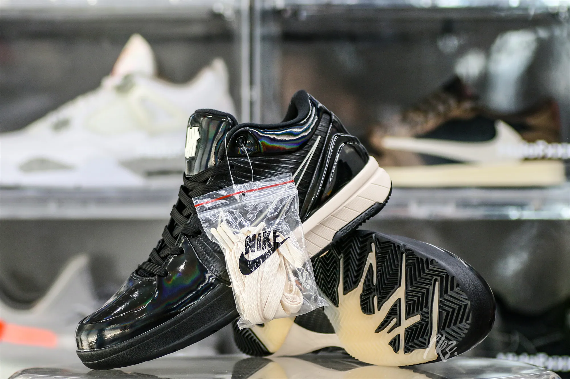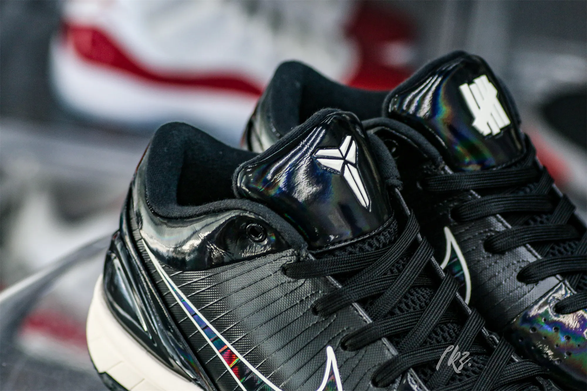 The Undefeated x Kobe 4 Protro ‘Black Mamba’ features a design inspired by Kobe Bryant’s nickname, highlighted by a black synthetic upper finished in an iridescent sheen that recalls the scales of the venomous snake. Unique details include Undefeated’s five strikes branding and Kobe’s personal logo atop each tongue, along with the Laker great’s ‘8’ and ‘24’ jersey numbers stamped on each heel.: