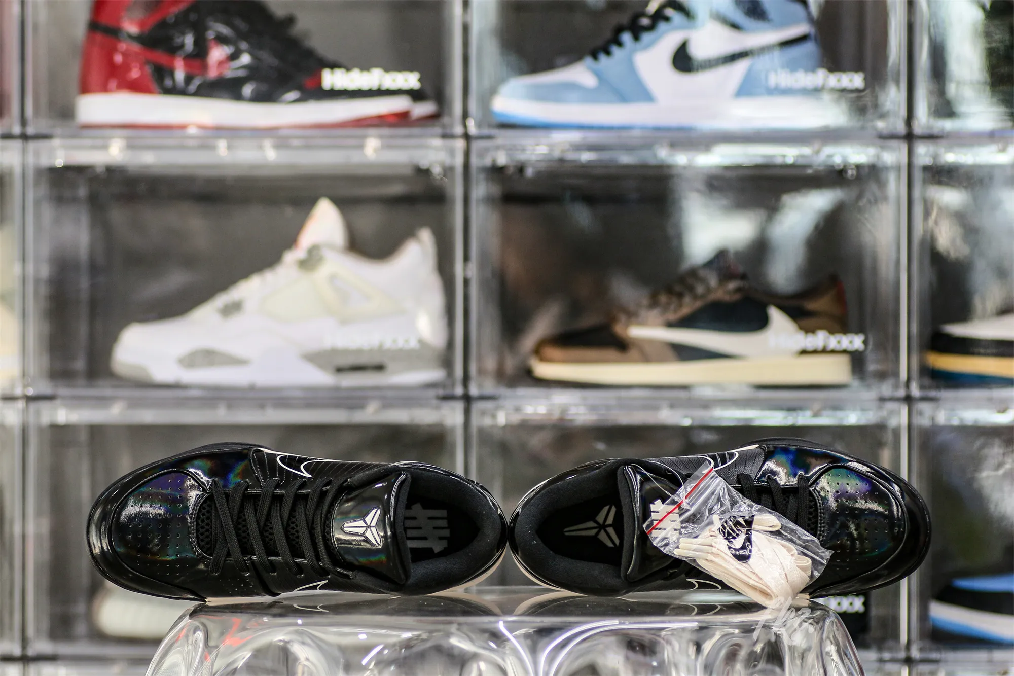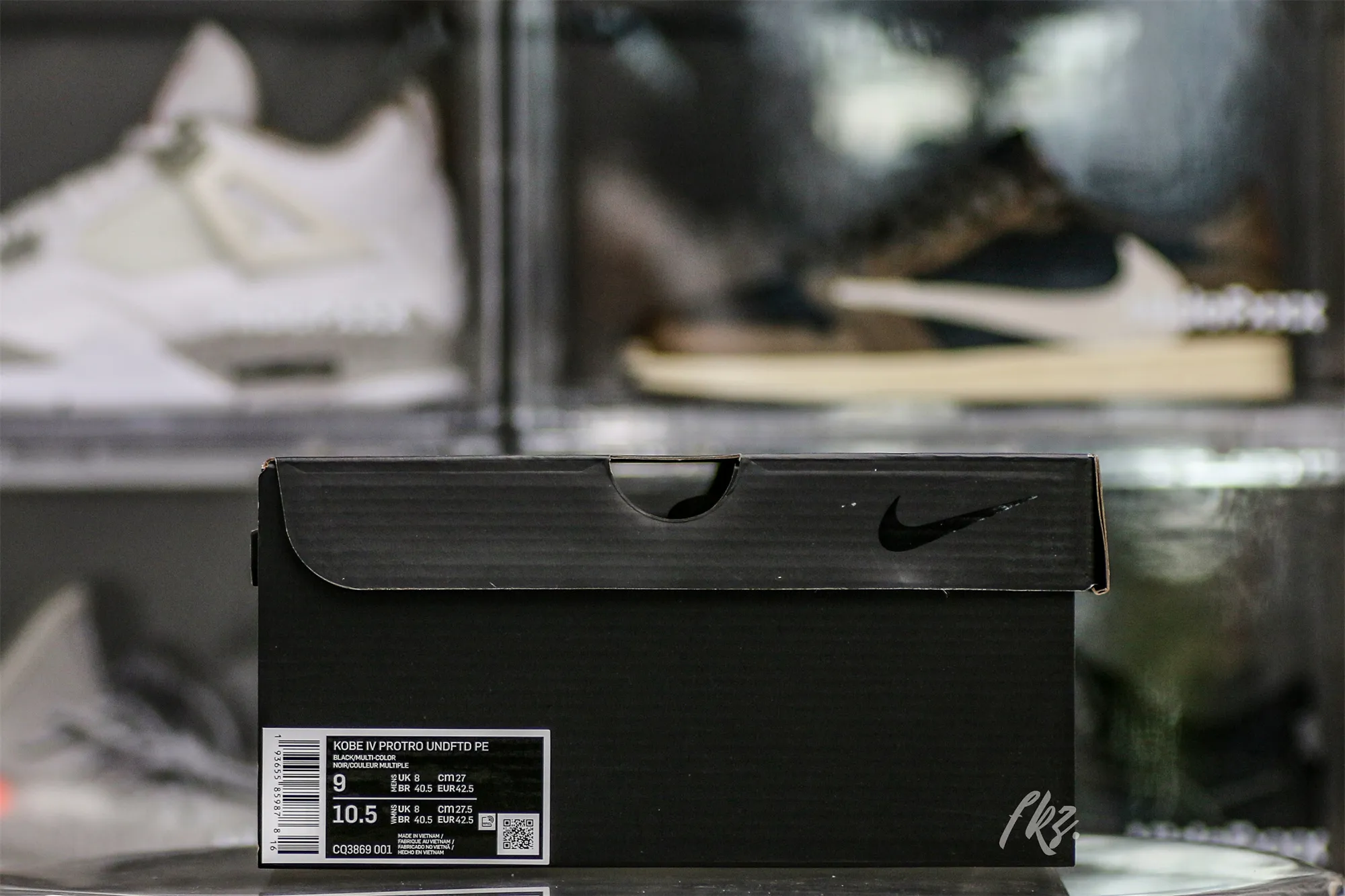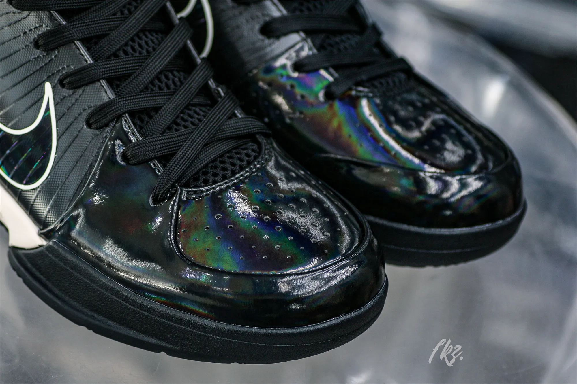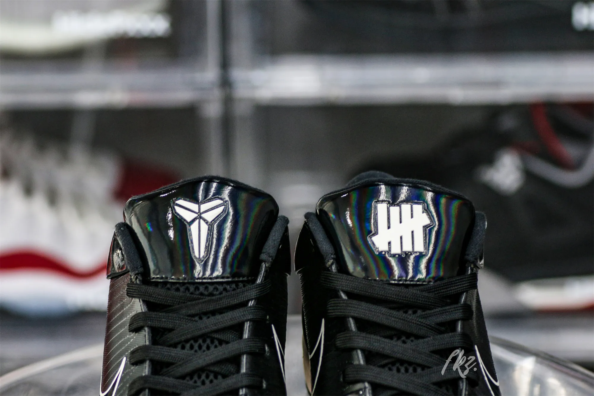 The Undefeated x Kobe 4 Protro ‘Black Mamba’ features a design inspired by Kobe Bryant’s nickname, highlighted by a black synthetic upper finished in an iridescent sheen that recalls the scales of the venomous snake. Unique details include Undefeated’s five strikes branding and Kobe’s personal logo atop each tongue, along with the Laker great’s ‘8’ and ‘24’ jersey numbers stamped on each heel.: