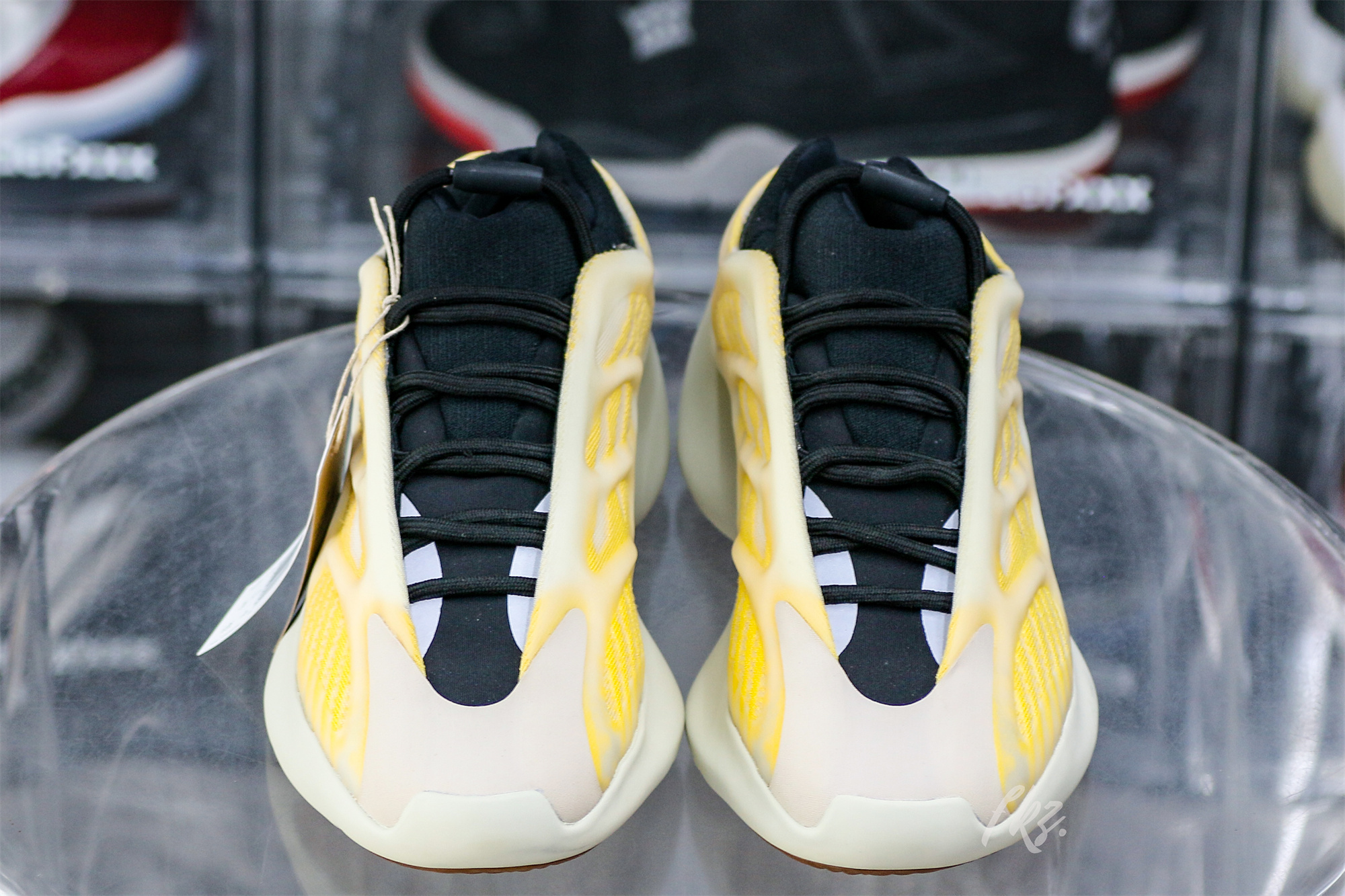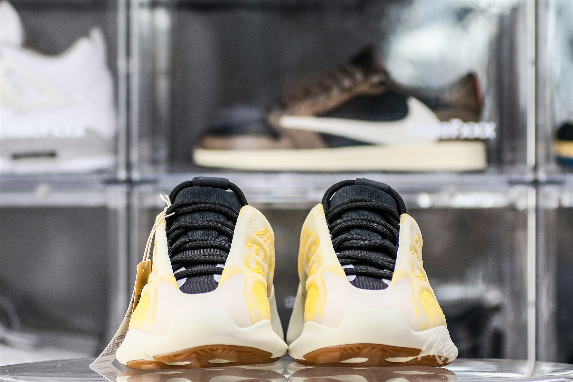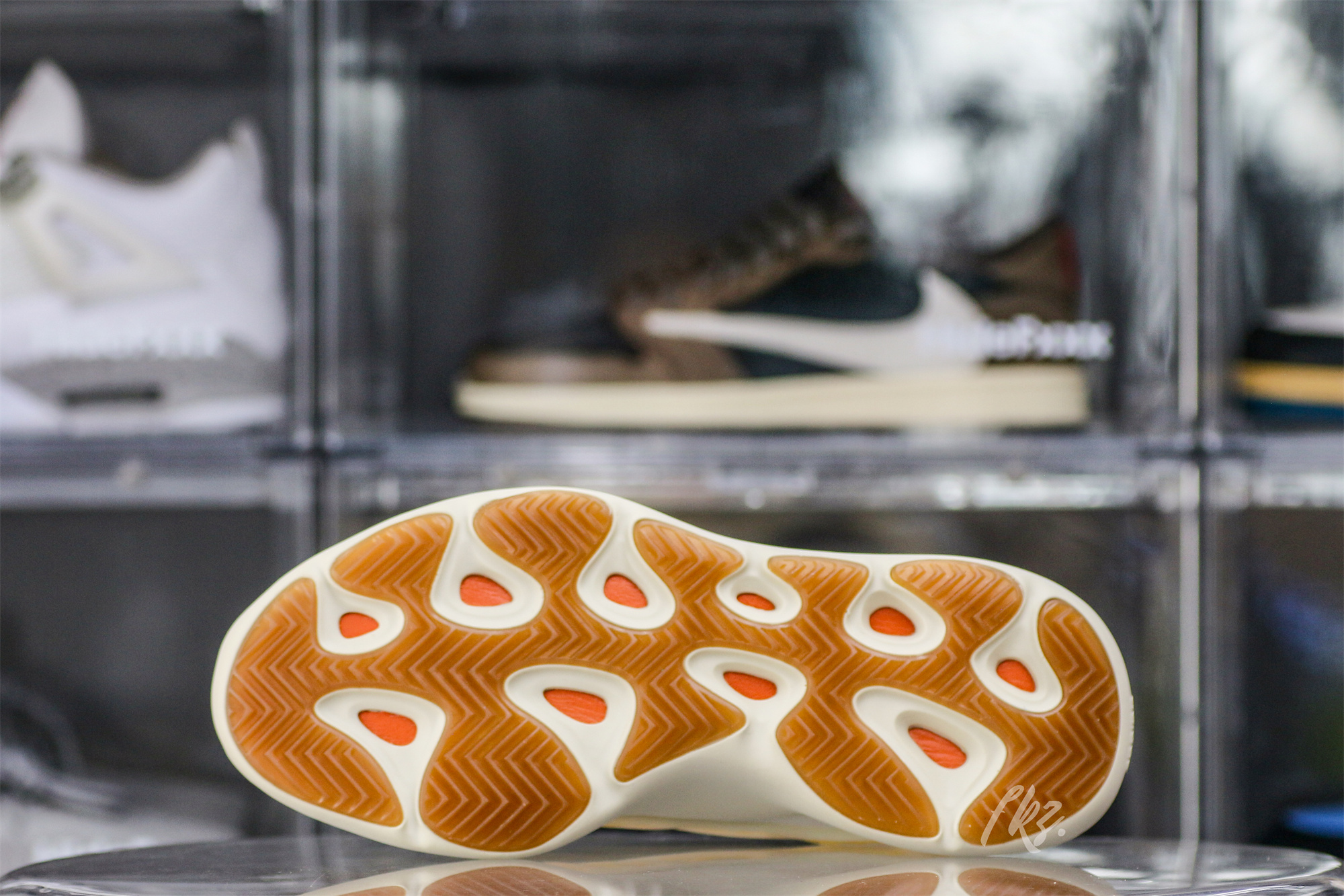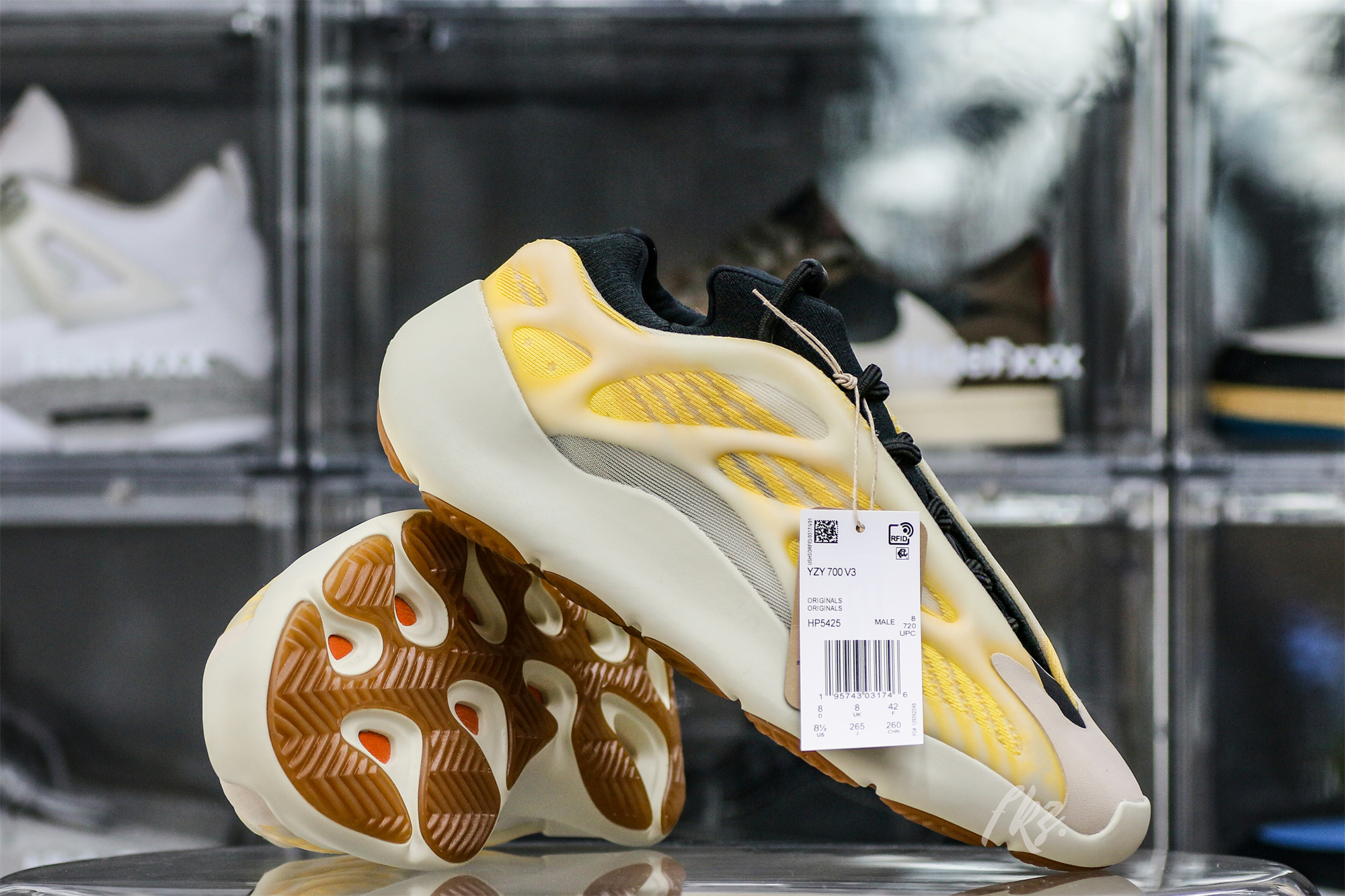 Drawing similar comparisons to the Yeezy 700 V3 ‘Safflower’ this new ‘Mono Safflower’ iteration makes small updates to create a new colorway. The upper is crafted with monofilament engineered mesh, featuring a cream base and striated orange lines that span the length of the profile. A semi-translucent RPU glow-in-the-dark cage overlays the shoe, while a PU encapsulated EVA midsole provides lightweight cushioning. The 700 outsole returns, with a classic herringbone pattern in gum rubber.: