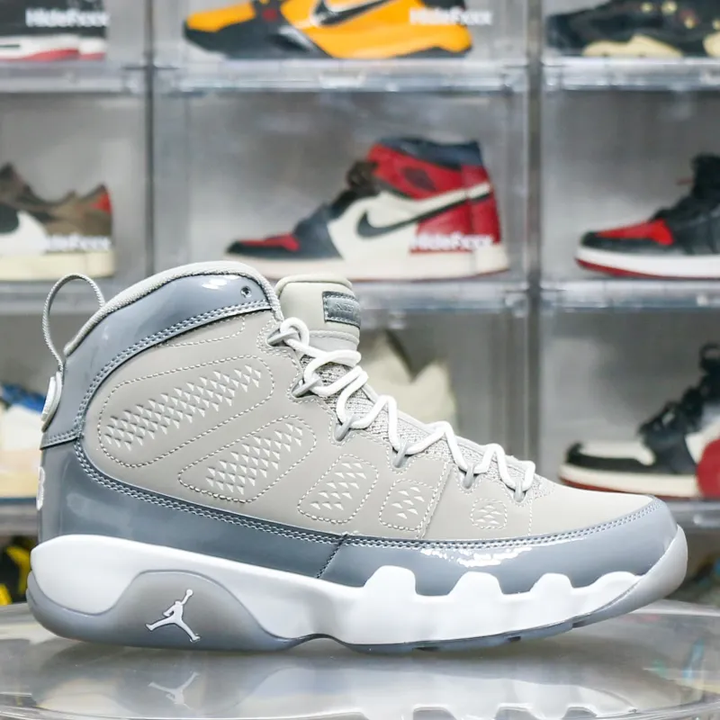 Bringing back the original 2002 release, the Air Jordan 9 Retro ‘Cool Grey’ exhibits a grey nubuck upper with a matching patent leather overlay. The Air Jordan tongue label and iconic ’23’ stamped on the heel maintain the signature look. These shoes have a white foam midsole with encapsulated Air-sole technology in the forefoot and heel. The grey rubber outsole has multilingual touches, a nod to Michael Jordan’s influence as a global icon.: