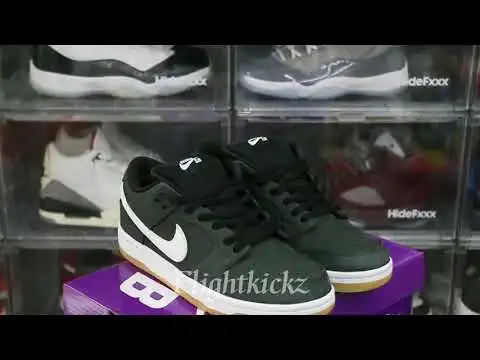 The Nike Dunk Low SB ‘Black Gum’ takes the classic silhouette and adds a practical color scheme composed of adaptable, understated tones. Smooth black nubuck forms the upper and is complemented by a Nike wordmark stitched onto the heel tab and a white leather Swoosh. The tongue is made of plush mesh and is well-padded, offering a comfortable fit. The sneaker’s cupsole is standard, with white sidewalls and a tacky gum rubber outsole. The low-cut profile, combined with a Zoom Air unit nestled in the sockliner, ensures that each stride feels responsive and cushioned.: