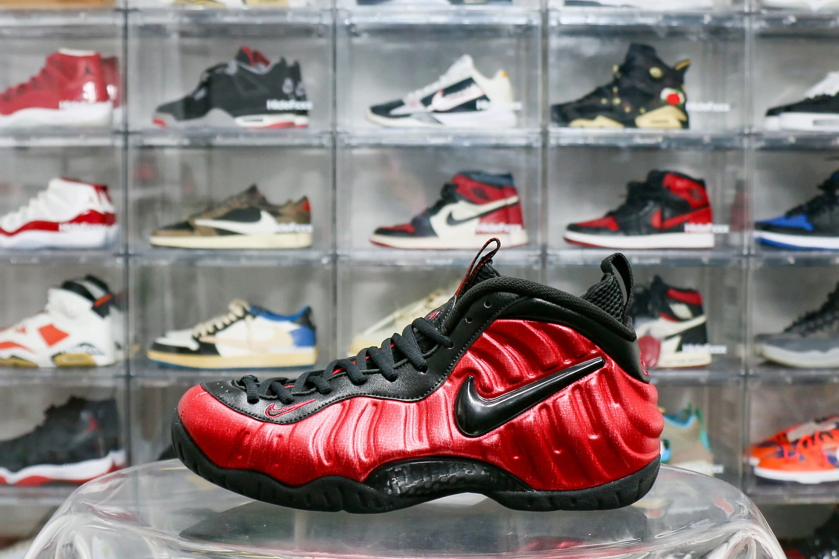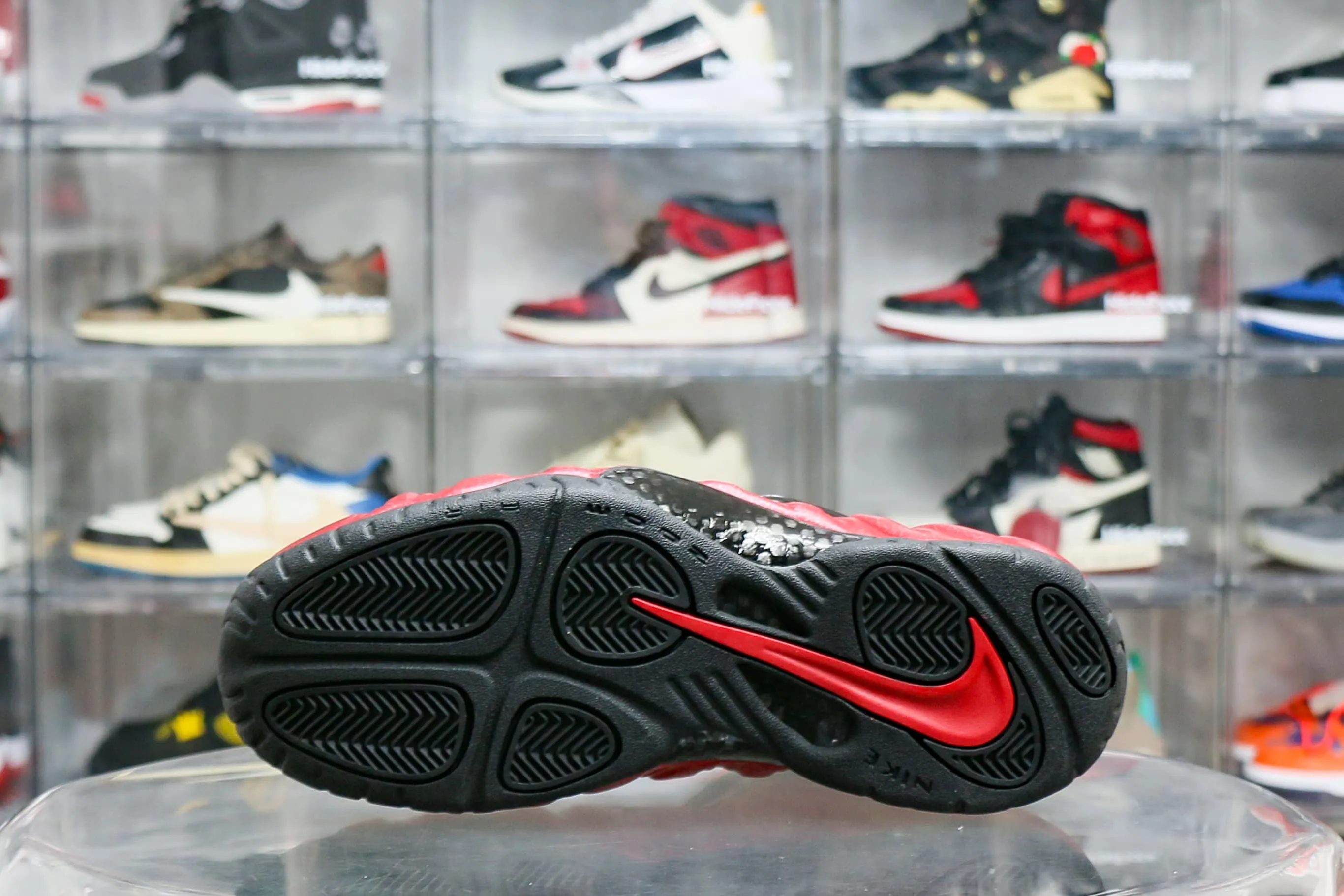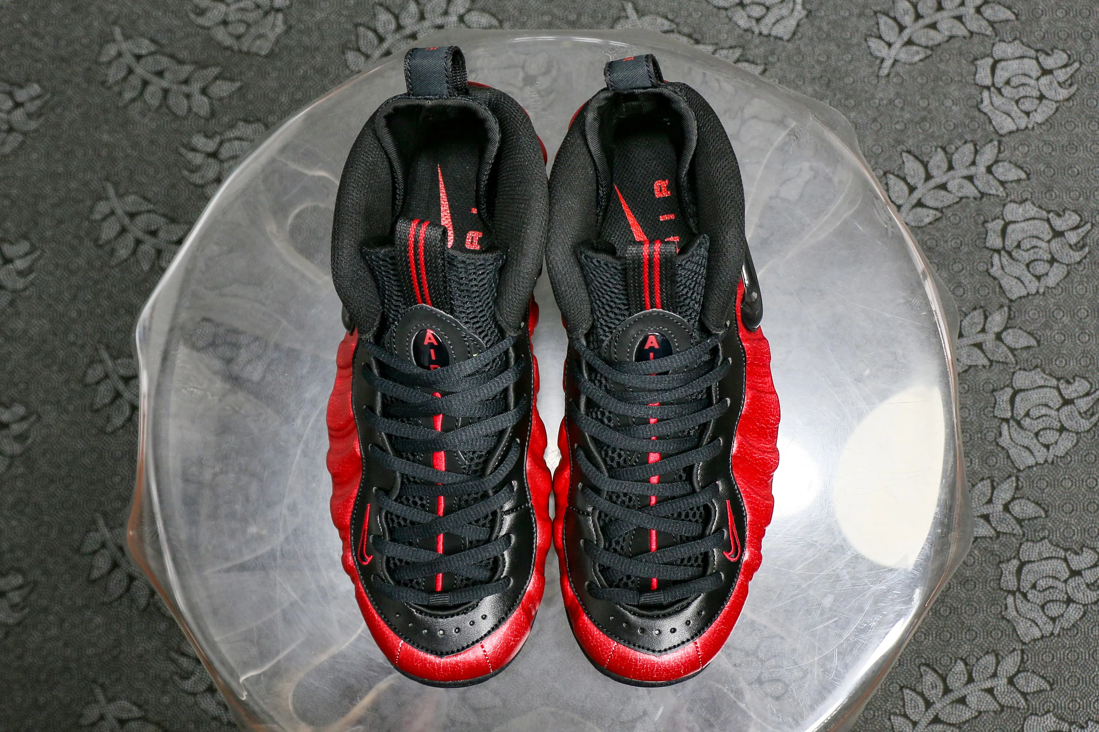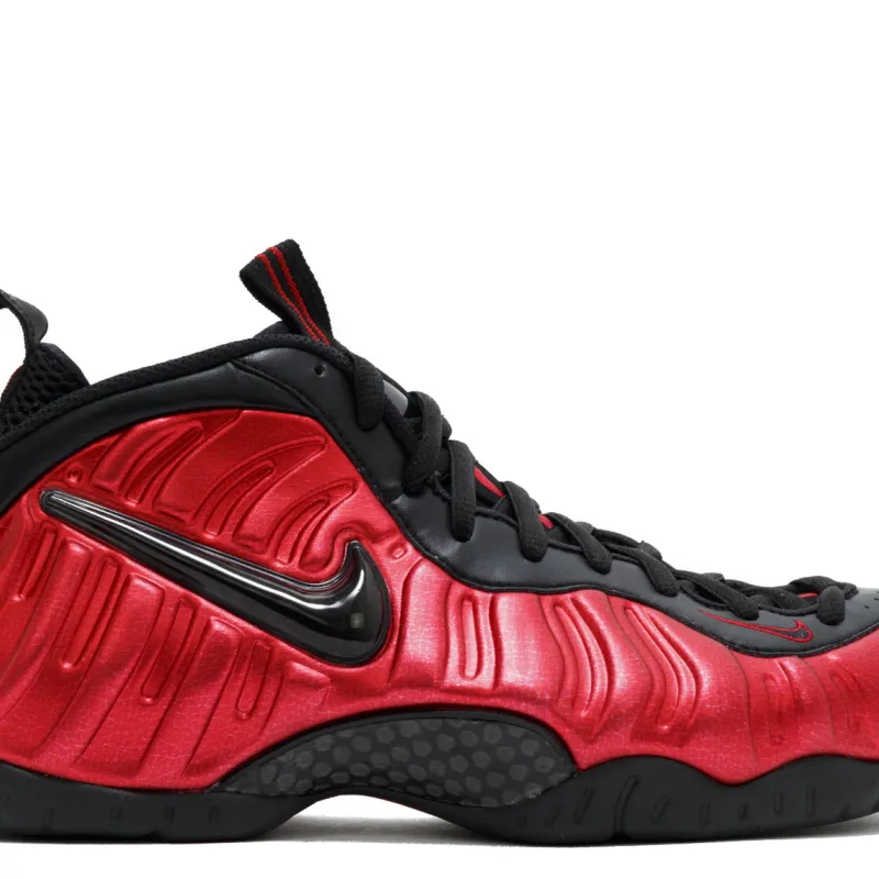 The Air Foamposite Pro ‘University Red’ features a look inspired by a 2002 ‘Varsity Red’ colorway, with bright University Red featured throughout the Foamposite upper. Contrasted by a black jewel Swoosh, more black emerges on the rest of the premium leather and mesh build. A carbon fiber shank supports the fit, and a solid black rubber outsole provides traction.: