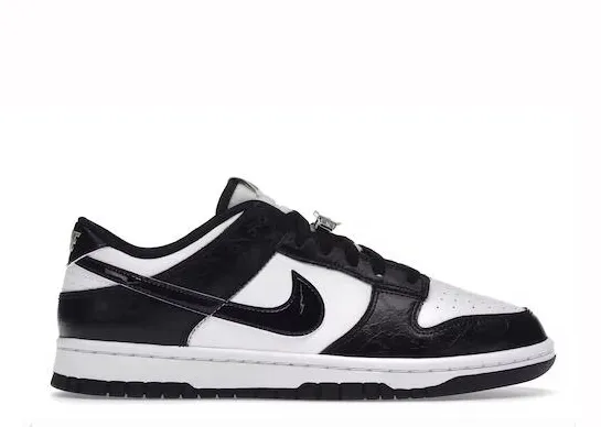 The Nike Dunk Low SE ‘World Champ’ embellishes the classic two-tone silhouette with decorations influenced by the world of professional wrestling. The low-top sneaker showcases a white leather base with black cracked leather overlays. The upper is accented by a black patent leather Nike Swoosh and embroidered Nike branding in metallic gold. A nod to a wrestling championship belt is found in the form of gold plated lace jewels while a black rubber outsole completes the look.: