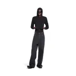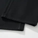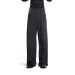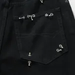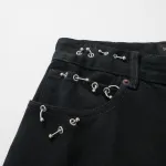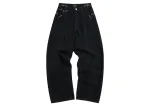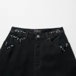 Black denim pants, soft left-hand twill denim fabric, unisex style, large size, mid-rise, concealed button fly, 5 belt loops, 5 pockets, metal embellishments around the waist and pockets, engraved curved buttons with BLCG logo, back adorned with BLCG logo patch. Available US sizes: XS, S, M, L.: