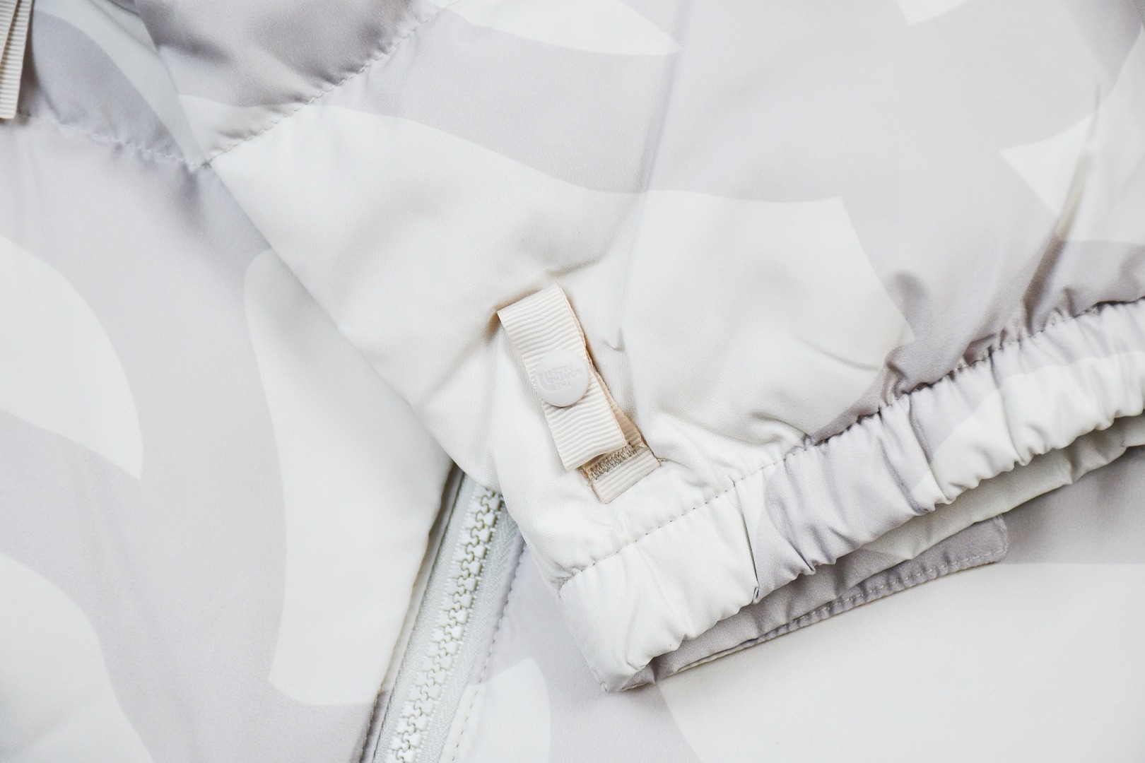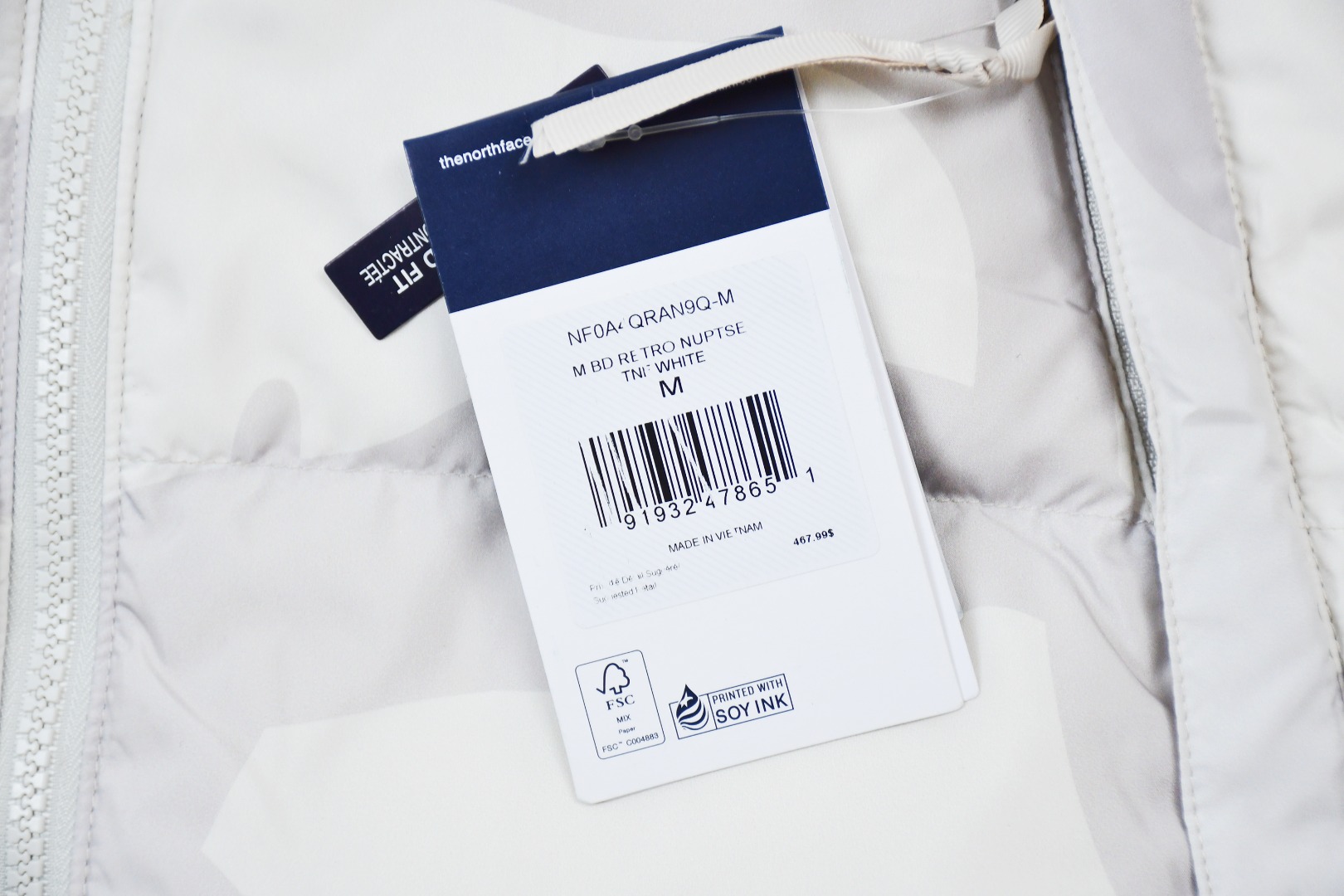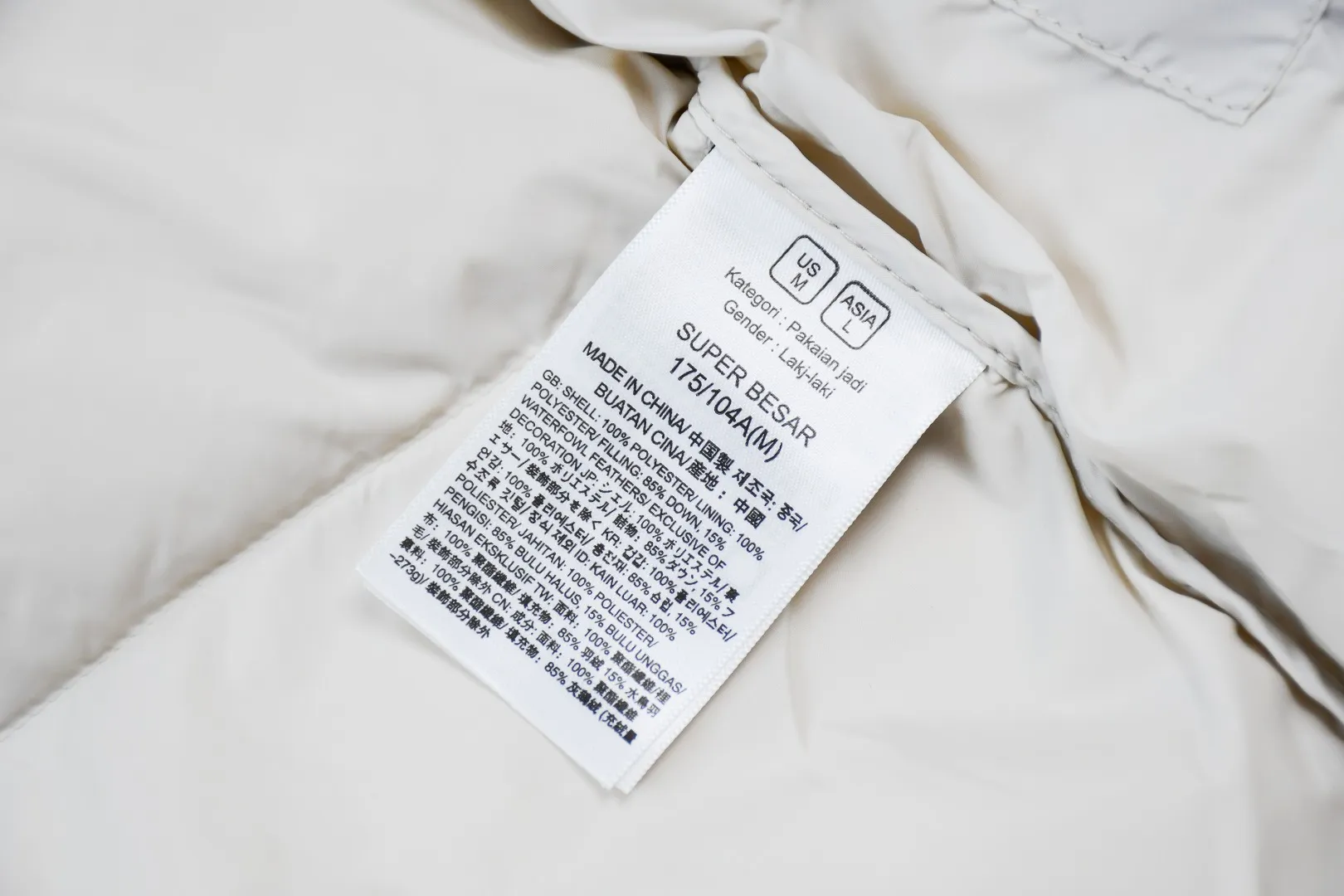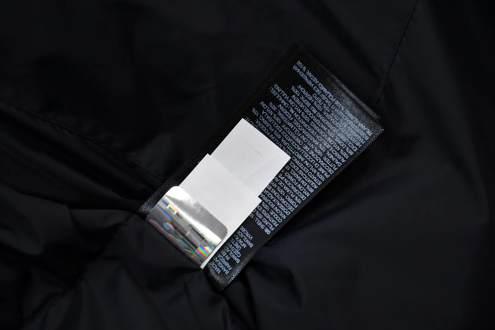 Dual-ended zipper on the right pocket allows the entire jacket to be packed into a compact bundle.: Correct auxiliary details include the neck label and washing instructions.